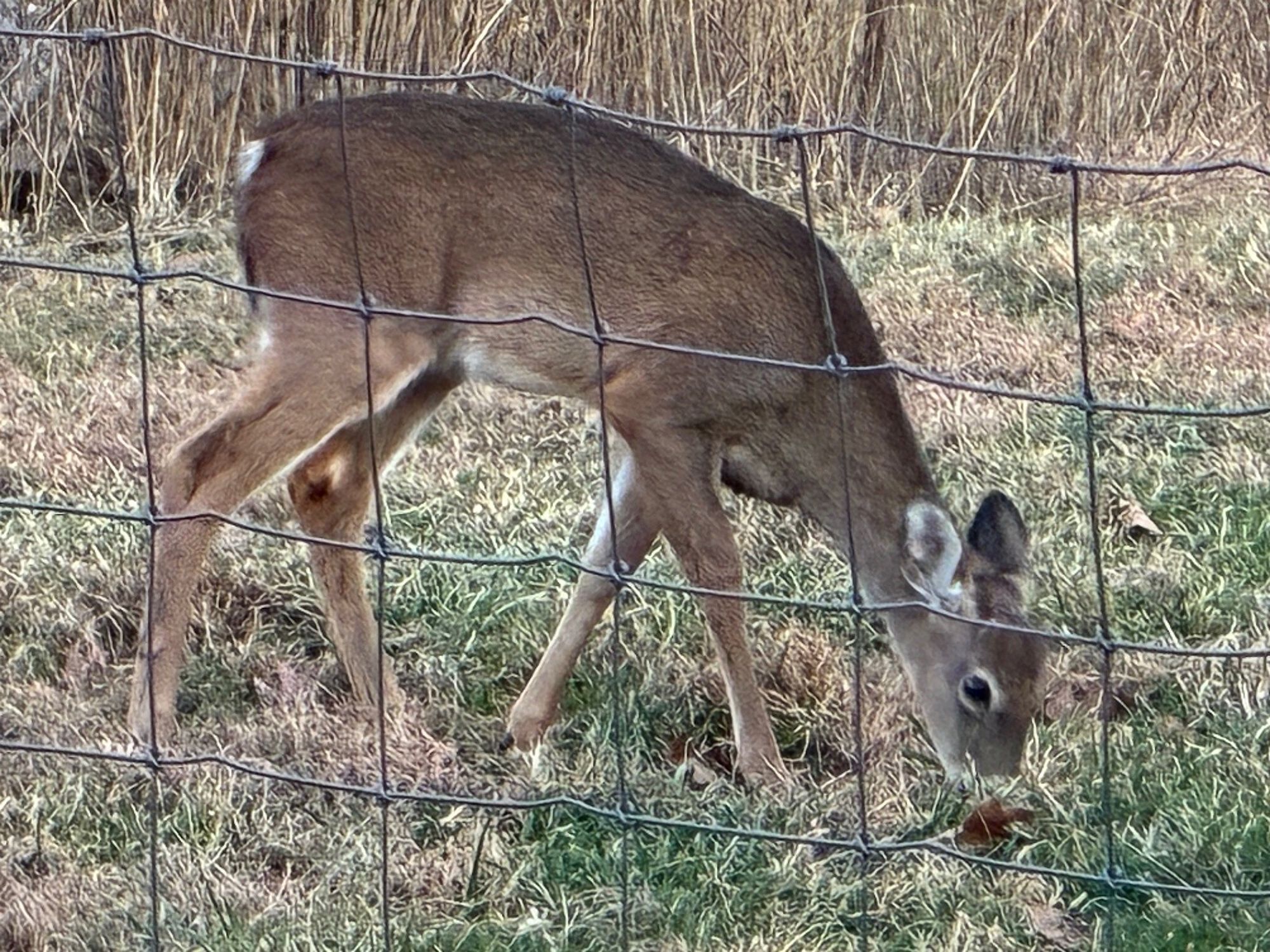 In late 2025, we spotted a new yearling in the east pasture who we think is a buck. We've named him Mac(rofauna). He hangs out very close to the barn and doesn't seem too skittish.