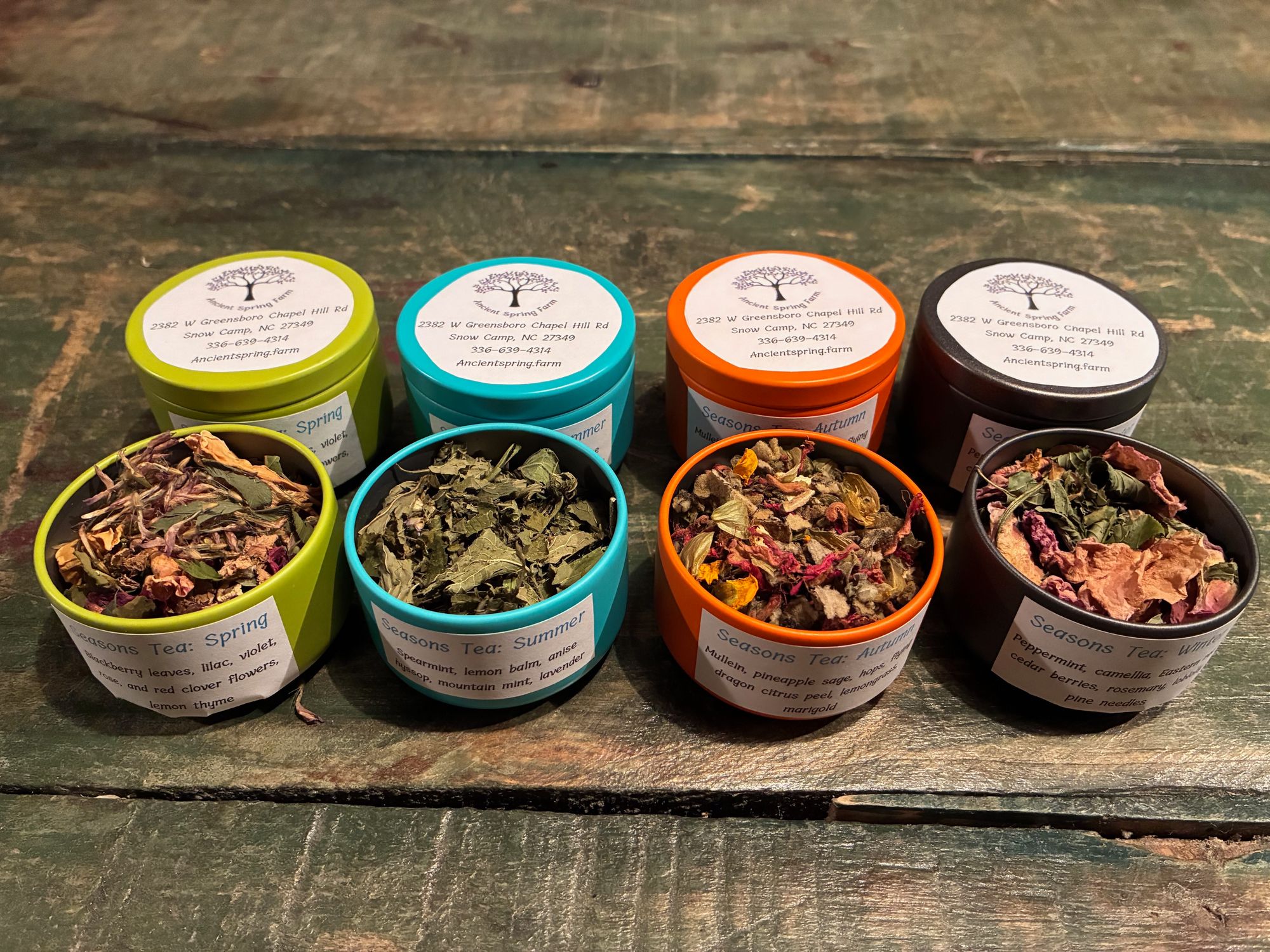 We're really excited about our new four seasons herbal tea blends! Each blend contains several kinds of herbs, flowers, berries, and/or other plant elements that grow on the farm during each season. Enjoy light and bright spring flowers, refreshing and energizing summer herbs, spicy and supportive fall flavors, and warming and restorative winter ingredients. $5 per tin, but $1 off subsequent purchases if you return the tin for a refill.