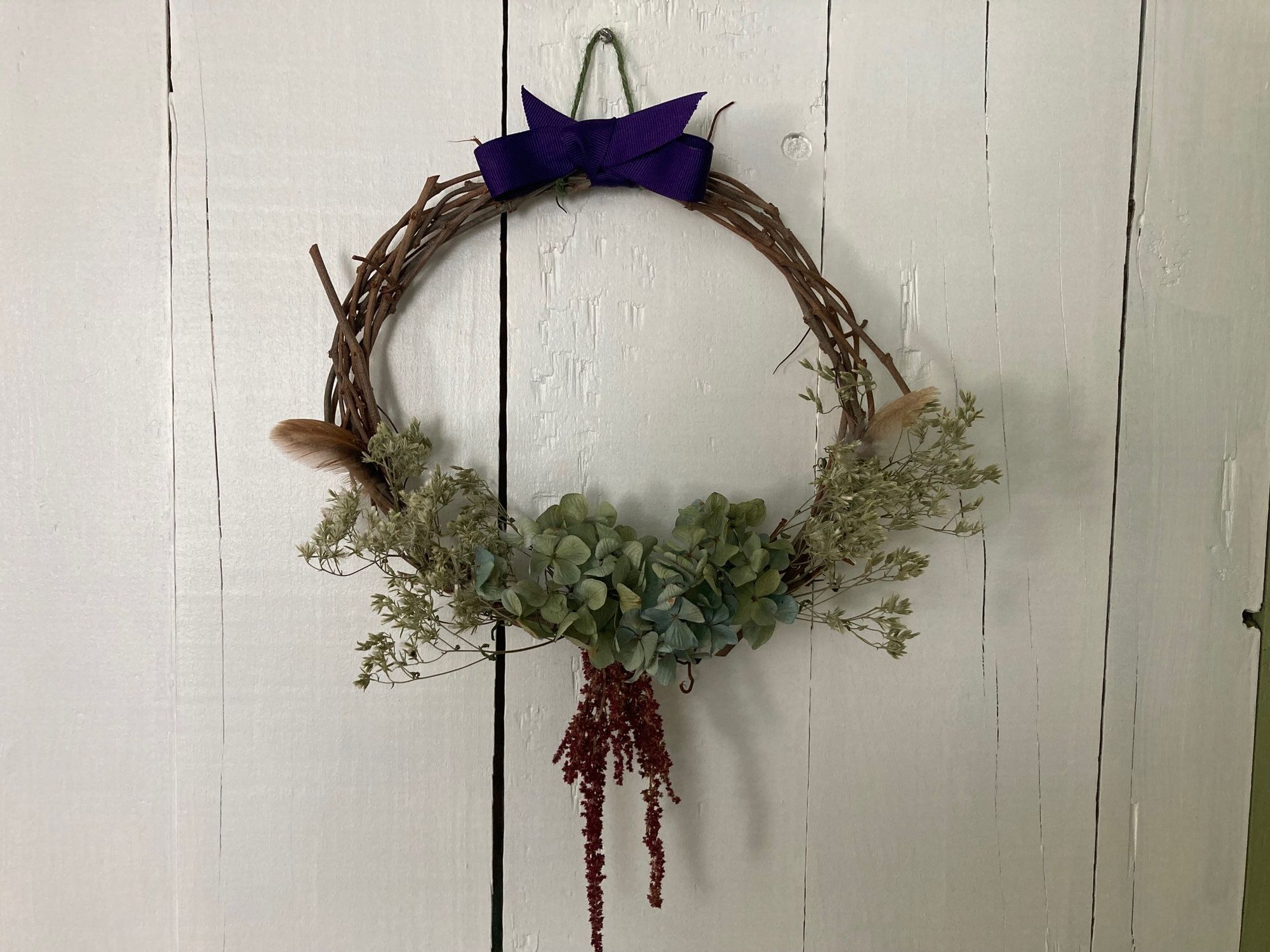 We decorate our homegrown muscadine vine wreaths with ribbons and all kinds of natural materials from the farm including dried flowers, herbs, seeds and seed pods, berries, evergreen boughs, and feathers. We take custom orders! Contact us to make a request.